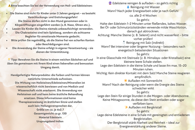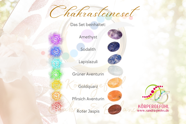 Chakrasteineset oval:Das Set beinhaltet die folgenden Edelsteine: roter Jaspis, Pfirsich Aventurin, Goldquarz, grüner Aventurin, Sodalith, Amethyst,